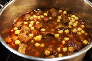 - When the meat is tender, add 1/2 cup pitted Kalama olives, 1/2 cup golden raisins and 1 15oz drained garbanzo beans. Stir to combine and cook for another 10 minutes.