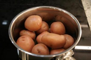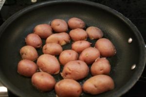 - Place 8-10 whole red skinned baby potatoes in a medium saucepan, rinse potatoes under running water, then cover with water. Bring to a boil, then reduce heat a fast simmer an cook for 15 minutes, or until the potatoes feel firm tender when pierced with the tip of a sharp knife.