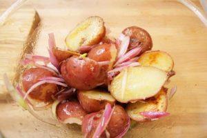 - Toss potatoes with vinegar and onion/shallot mixture. Adjust seasoning and/or vinegar to your taste.