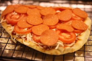This is one of the easiest and tastiest lunches to make. Generally, the only ingredients you really need at home are flat bread, naan, bottled tomato sauce, whether pizza sauce, spaghetti sauce, or any kind of red sauce, plus grated mozzarella cheese. From this point add what ever else is in the fridge. Sliced pepperoni, smoked ham, chicken, mushrooms, green/red peppers, thinly sliced red onions, what ever you have. The base sauce could as easily be a light coating of Dijon mustard or smoky BBQ sauce.
