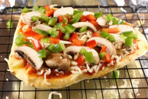 - Add toppings, in this case mushroom slices and chopped green and red pepper.