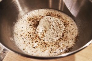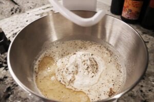 - Combine 2 1/4 cups flour, 2 tsp freshly ground black pepper and 1 tsp kosher salt in a medium mixing bowl.