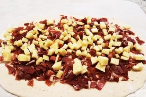 - Sprinkle flour on a sheet of parchment paper and roll the dough into a 10 x 18 inch rectangle and spread the prosciutto, pancetta and cheese on the dough.