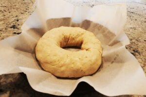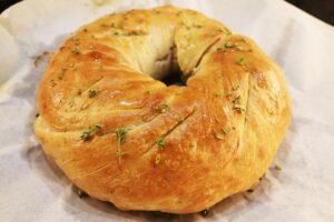 - Roll the dough into a log, starting at the long end. Gently twist the log and then form a ring.