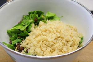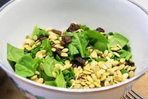- In a separate medium bowl, combine finely chopped spinach or arugula, pepitas, currants or raisins, olive oil, lemon zest and lemon juice.
