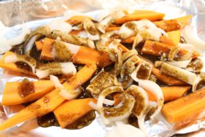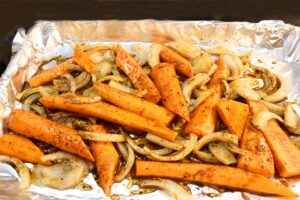 - Line a sheet pan with non-stick aluminium foil and transfer sliced onions and carrots to sheet pan.