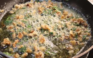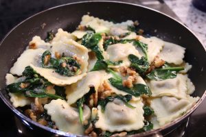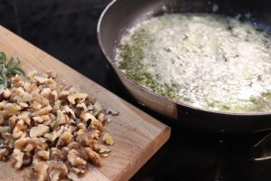 - While the ravioli is cooking, melt 2 tbsp unsalted butter in a medium sized skillet over medium-low heat and add 2 tbsp olive oil. When the butter starts to foam, add 2 cloves grated garlic and 1/4 cup rough chopped walnuts and stir to combine.