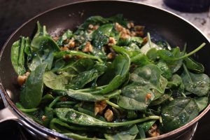 - Add 2 large handfuls of fresh baby spinach to the mixture and season with kosher salt and freshly ground black pepper, reduce heat to low and stir occasionally until the spinach is mostly wilted, about 4-5 minutes.