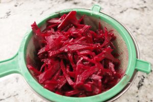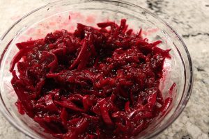 - Pour vinegar mixture over grated beets and cover with cling wrap. Cool to room temperature then refrigerate overnight.