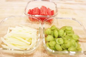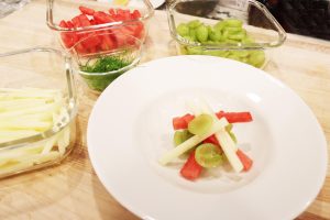 - Julienne 1 whole peeled honey crisp apple and 1 slice watermelon about 3" thick and slice 10 whole white seedless grapes.