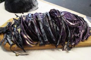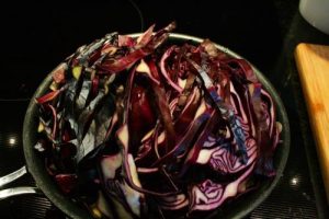 - Add sliced cabbage in handfuls and cook over medium heat, covered, turning periodically and adding more cabbage with each toss and with each turn.