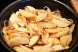 - Add sliced apples, toss to combine and cook for 3-4 minutes.