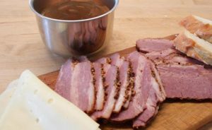 - Slice the corned beef into very thin slices. Cut 1/2" thick slices from a rustic loaf of bread.