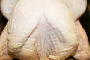 - If stuffing, prepare your stuffing, allow it to cool to room temperature and stuff the cavity at the neck and under the breast of the turkey. Secure with a couple of wooden skewers