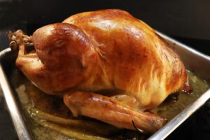 If you use my secret formula for making Roast Turkey it will look like this one! I allow at least 3 hours for a 10 pound turkey but the color of the turkey will tell you when its done. My formula is pretty simple. It starts with seasoning the turkey with kosher salt the night before you plan to roast it and then roasting uncovered, slow and low, at 325° until the skin becomes the perfect color.