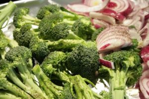 - Place 2 heads broccoli cut into florets on sheet pan and 1/2 red onion sliced at one end, drizzle with olive oil and season with kosher salt. Toss to combine.