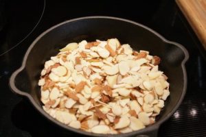 - Toast 1 cup sliced almonds in a shallow pan over medium heat for 5-6 minutes, until fragrant. Remove from heat and reserve.
