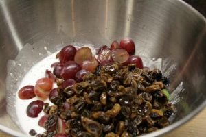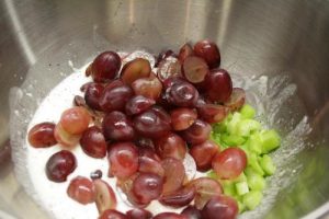 - Combine 1/2 cup mayonnaise, 2 tbsp milk, 1 tbsp sugar, 1 tbsp white wine vinegar and season with Kosher salt and freshly ground black pepper in a large bowl. Stir to combine. Add 1 cup chopped celery and 2 cups red seedless grapes sliced in half and combine with dressing.