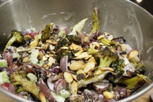 - Add roasted broccoli and red onion to dressing and toss all to combine.