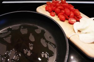 - Heat 1 tbsp olive oil in a deep sided skillet with a lid over medium high heat.