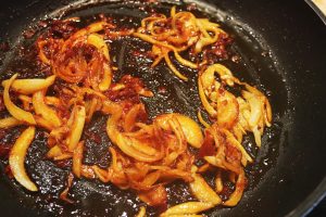 - When the oil is hot, add 1/2 large onion, thinly sliced and fry until caramelized, about 8 minutes. Stir frequently to prevent sticking and burning.