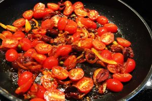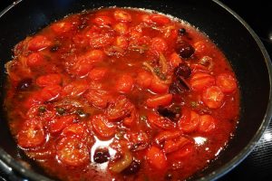 - Add 3 tbsp Rose Harissa, 1/2 lb cherry tomatoes, halved, 6-8 whole kalamata olives, halved, 1 tbsp capers and 1 tbsp honey. Stir and cook until the tomatoes start to break down, about 5 minutes.