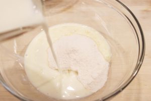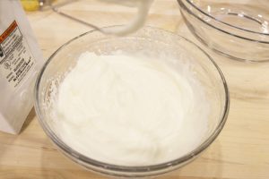 - Whip 1/2 cup 35% whipping cream adding 1 tbsp powdered sugar until peaks form and combine with prepared custard.