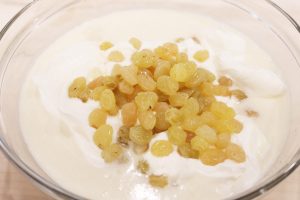 - Reserve 4-5 tablespoons of rum soaked raisins for garnish, then combine the remaining raisins and any remaining rum, the whipped cream and the custard cream in a bowl and gently fold until combined.