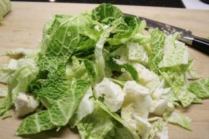 I don’t think that I particularly liked this dish growing up, but I do enjoy it now. I have used both Savoy cabbage and Kale, but plain white cabbage would work as well. The dish is not ‘cabbage-y’ as you might think, instead it’s a nice change and goes great with Au Naturele Pork Chops!