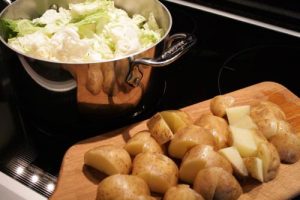 - Cube 2-3 small potatoes and combine with cabbage in a medium sized stock pot.