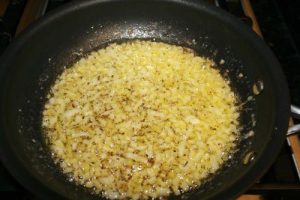 - Add one tablespoon of oil to a small skillet, and heat over medium high heat and add finely chopped onion. Cook, stirring occasionally, until the onions become soft but do not color, about 5 minutes.