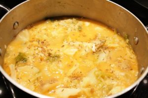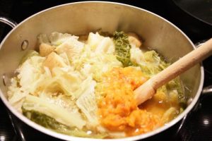 - Add one tablespoon of flower, cook, stirring, for about 5 minutes, or until the flour starts to color, remove from heat. Grate 1 clove of garlic into roux, and stir to combine. Add a teaspoon of paprika and stir again to combine. Add 2 ladles full of cooking liquid and stir to combine, then add the roux to the potato cabbage mixture and stir to combine.
