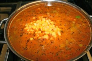 - Add 2 tsp thyme, 1 bay leaf and 2 cans (11 oz) corn and 5 cups chicken stock to cover by a couple of inches.
