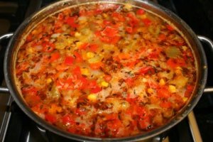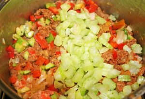 - Add 1/2 cup chopped celery, 1/2 cup chopped green bell pepper and 1/2 cup chopped red bell pepper to meat mixture and stir to combine, cook for another 5- 10 minutes