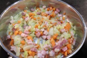 - Melt 1/4 cup unsalted butter or olive oil in a large deep sided pan over medium heat. Add 1 medium onion finely chopped, 1 stalk celery, chopped, 1 small carrot, chopped and 1/4 lb bacon cut into lardons. Cook until the onions are golden and soft, about 5-6 minutes.