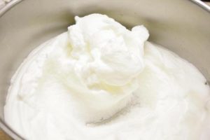 - Using a hand mixer, whip egg whites until they form stiff peaks.