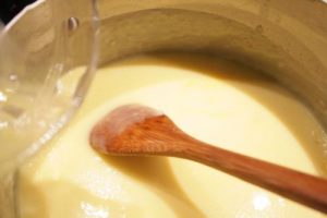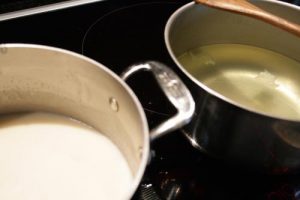 - Using the same pot, melt 2 tablespoons of butter over medium heat and add 3 tbsp all-purpose flour. Stir to combine and cook for 2-3 minutes. Then, add 1 1/2 cups cooking liquid into roux and whisk with a wire whisk to get rid of any lumps. Add 1/2 cup milk and allow to cook until the sauce is thickened, 4-5 minutes. Remove from heat and allow it to cool slightly.