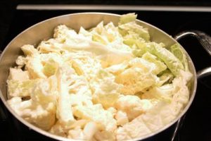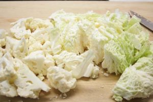 - Chop 1/2 head Savoy cabbage into large dice and break 1/2 head cauliflower into florets.