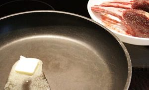 - Heat a large skillet over medium high heat for 1-2 minutes, add 1 tablespoon of butter. When the butter is sizzling, add the venison.