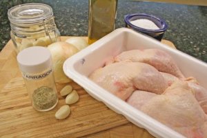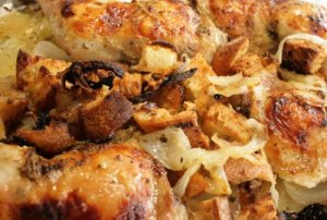 - Bake in a pre heated oven for 30-45 minutes, or until the chicken is nicely browned and the onions and bread toasted.