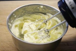 - Beat 1/2 lb unsalted butter at room temperature with a hand mixer on high until light and fluffy, about 2-3 minutes.