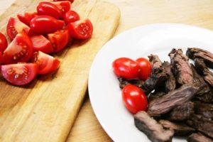 - Add sliced skirt steak and fresh tomatoes to salad.