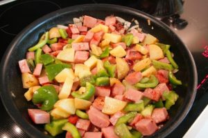 - Add reserved potatoes and green peppers and sauté for a further 4-5 minutes.