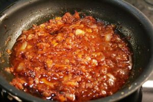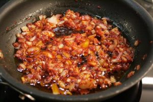 - Add 2 tbsp olive oil, 1 whole shallot, finely chopped, 2 cloves garlic, grated and 2 tbsp tomato paste to a cold skillet over medium heat. Sauté, stirring frequently, until the oil starts to bubble.