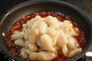 - Return pan to the heat, quickly add 1 14 oz can butter (lima) beans drained, 1 tbsp red wine or sherry vinegar and 1/4 cup olive oil and season with kosher salt. Stir to combine and cook for a further 5 minutes.