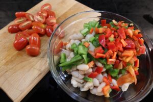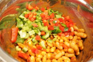 - Drain 1 16 oz can cannellini or tondini beans and rinse and place in a medium mixing bowl. Add 1/3 medium red onion, 1/3 whole red and green bell pepper cut into 1/4" dice and 1/2 cup celery stalk cut into 1/4" dice. Halve 4-6 baby plum tomatoes if using for garnish.