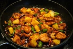 This Spicy Shrimp with Roasted Pineapple dish comes together very quickly so it’s a good choice for a week-night dinner. I used Thai red chili paste as it is not overly spicy but adds a really nice color to the dish. If you like it hot, adjust the sauce to your liking.