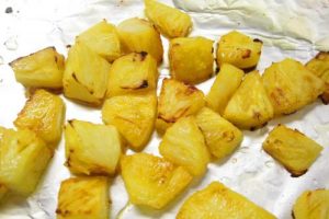 - Heat drizzle of canola oil in a medium sized skillet over medium high heat. Add 1 cup cubed pineapple pieces and cook until slightly charred, about 3-4 minutes. Remove from pan and set aside until ready to use.