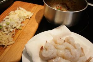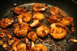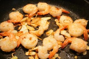 - Add 6-8 large uncooked shrimp/person and stir to combine. Sauté for about 1-2 minutes or until the shrimp begins to turn pink.