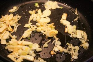 - Add 5 cloves grated garlic, 1 tbsp grated ginger and scallion whites, stirring constantly for 1 to 2 minutes.